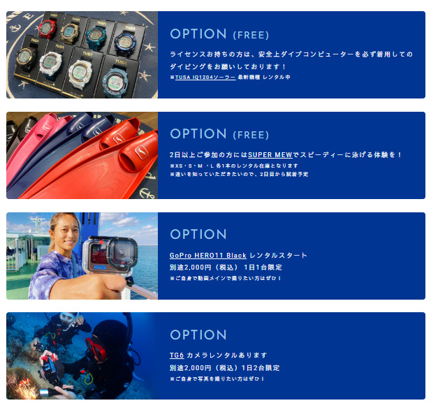 ・Participants who dive are over 60 years old are required to provide a doctor’s certificate to show you are of good health.